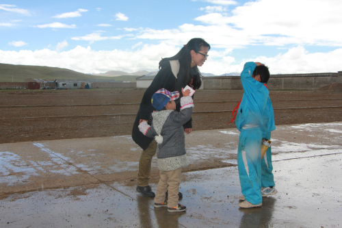 2007年8月援教期滿后,白覺措回到拉薩,在當(dāng)雄縣納木湖鄉(xiāng)中心小學(xué)任教。四千八百米的納木湖鄉(xiāng)中心小學(xué)是拉薩市海拔最高的學(xué)校。每到冬天,這里都會(huì)迎來大風(fēng)雪。而在大雪封山時(shí),蔬菜是運(yùn)不進(jìn)來的。所以,白覺措和其他老師還要利用休息的時(shí)間帶領(lǐng)學(xué)生們在學(xué)校的高寒溫棚內(nèi)自己種菜,以備不時(shí)之需。白覺措淡淡得說道:“這里的夏天是很美,冬天卻讓人受不了。而且夏天并不是天天都是風(fēng)和日麗,時(shí)不時(shí)還會(huì)來場冰暴。”正說話間,豆大的冰雹就下起來,“噼哩叭啦”打在窗戶上。白覺措急忙起身向外走去,因?yàn)檎滴顼垥r(shí)間,學(xué)生們正朝食堂走向。天冷地滑,怕學(xué)生摔倒白覺措拉著自己兩歲半的兒子,站在空地上,對著遠(yuǎn)處跑來的學(xué)生不停地喊道:“慢點(diǎn),慢點(diǎn),小心摔倒!……”。
