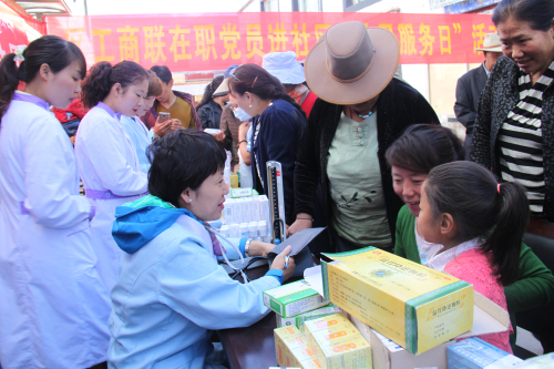 根據(jù)自治區(qū)工商聯(lián)《關(guān)于深化區(qū)直機(jī)關(guān)在職黨員到社區(qū)服務(wù)群眾活動(dòng)》的統(tǒng)一安排:阜康醫(yī)藥有限公司四個(gè)黨支部,在張德才總院長的帶領(lǐng)下,一行8人在2015年8月8日上午到拉薩市城關(guān)區(qū)嘎瑪貢桑社區(qū)進(jìn)行義診活動(dòng),帶著1.5萬余元藥品和便攜式B超,心電圖等。在半天時(shí)間內(nèi)貢義診380余人,為社區(qū)群眾進(jìn)行了測量血壓、發(fā)放藥品、健康咨詢等,受到了社區(qū)群眾的熱烈歡迎。期間正在慰問群眾的自治區(qū)政協(xié)副主席阿沛晉源,和區(qū)統(tǒng)戰(zhàn)部副部長、區(qū)工商聯(lián)黨組副書記李瑞富等領(lǐng)導(dǎo)的高度評價(jià)。