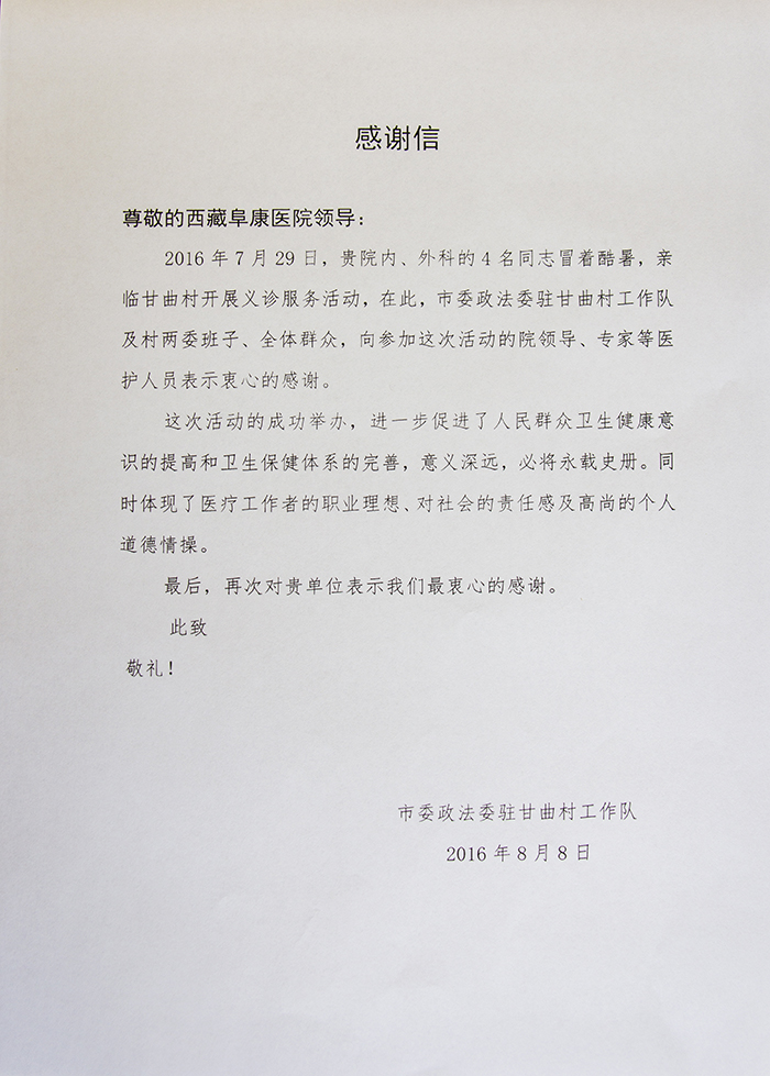 2016年7月,林周縣朱加村村委會、甘曲村村委會受當(dāng)?shù)卮迕袼?,與林周縣人民醫(yī)院和西藏阜康醫(yī)院相關(guān)負責(zé)人取得聯(lián)系,希望能夠派遣醫(yī)療義診隊為當(dāng)?shù)卮迕衩赓M義診。7月29日經(jīng)相關(guān)領(lǐng)導(dǎo)協(xié)調(diào),西藏阜康醫(yī)院派出了由外科專家李玉仲、內(nèi)科專家劉占懷及幾名護理人員組成的義診小分隊先后前往朱加村、甘曲村為當(dāng)?shù)卮迕衩赓M義診。