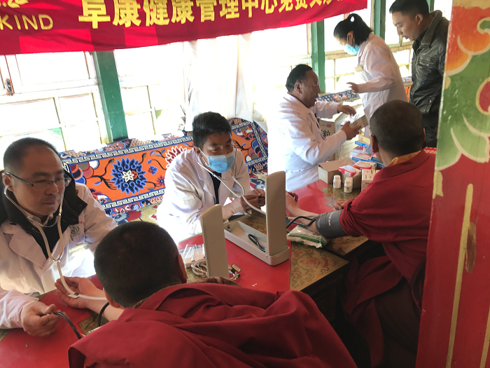 隨后,義診活動井然有序地開始了,張?jiān)洪L和田豐輝醫(yī)生負(fù)責(zé)測血壓,護(hù)士唐宗青測血糖,瓊瑪負(fù)責(zé)發(fā)放藥品,占堆(我院體檢中心醫(yī)務(wù)人員)對每一位血壓、血糖高的僧人、群眾進(jìn)行登記,有利于以后對他們的健康進(jìn)行隨訪跟蹤,了解他們有無不適以及血壓、血糖情況,督促他們的按時(shí)服藥、并指導(dǎo)他們健康的生活方式。在義診體檢過程中,一名76歲的老人,血壓200/120mmHg,經(jīng)過詢問,老人身體并沒有不適,在詳細(xì)的給老人講解了高血壓對身體健康的影響,以及高血壓帶來的危害后,并給予老人免費(fèi)發(fā)了治療高血壓的藥物,囑咐他這幾天要每天規(guī)律服用降壓藥物、監(jiān)測血壓,直至血壓在正常范圍后可以改為三到五天測一次血壓,但降血壓藥物不能停止,老人欣然接受意見,并握手致謝。