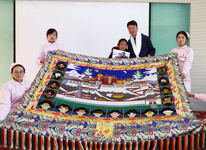 梅朵在出生后不久就被查出患有食道閉鎖、肛門畸形,在阜康全額資助下赴成都手術(shù)。手術(shù)后,梅朵的身體還是不太好,近兩年經(jīng)常住院,阜康醫(yī)院又為她減免全部的醫(yī)療費(fèi)用,為了表達(dá)對阜康的感激之情,梅朵媽媽用3年時間,編織了一幅布達(dá)拉宮唐卡,在活動現(xiàn)場送給了王斌書記。