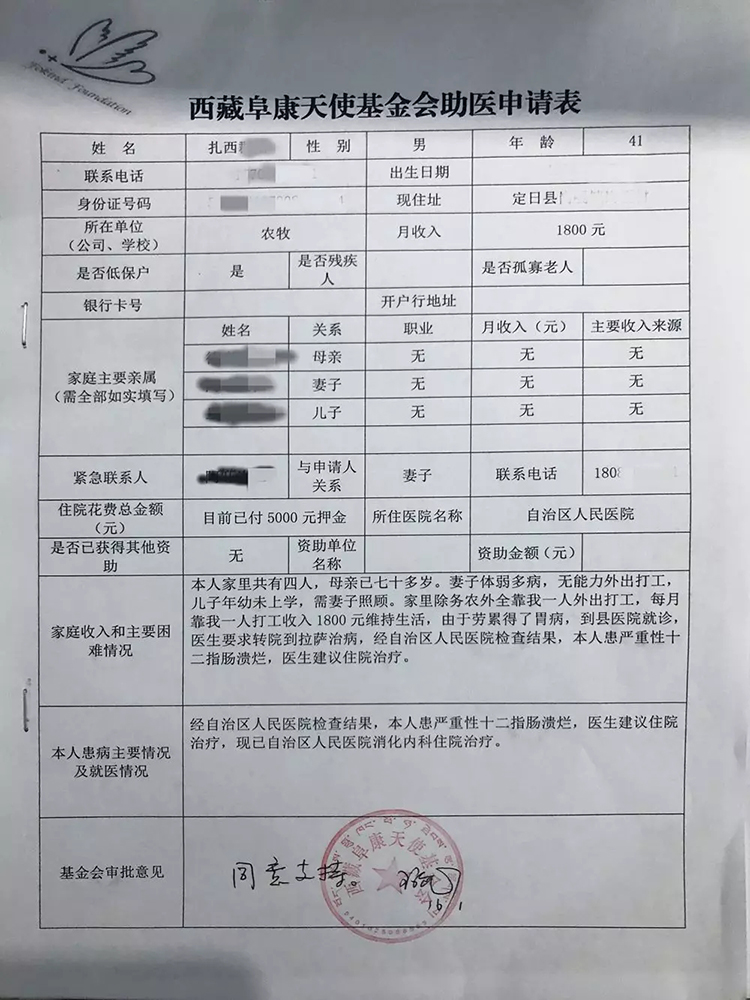 據(jù)了解,扎西因勞累患上胃病,在縣醫(yī)院的建議下轉(zhuǎn)至自治區(qū)人民醫(yī)院治療,經(jīng)自治區(qū)人民醫(yī)院檢查確診為:十二指腸潰瘍,建議入院治療。但扎西的家庭十分困難,妻子體弱多病,全家僅靠扎心每月打工收入1800元維持生活,無力支付醫(yī)療費(fèi)用。在社會(huì)好心人士的介紹下,向阜康天使基金會(huì)提出了助醫(yī)申請(qǐng)。