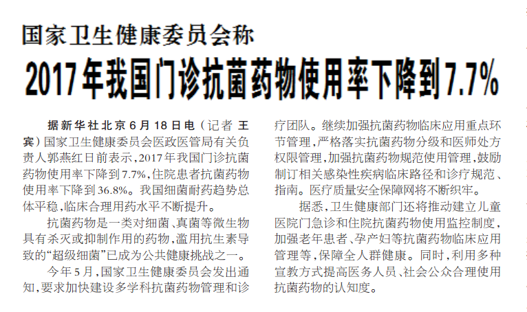 據(jù)新華社北京6月18日電 (記者 王賓) 國(guó)家衛(wèi)生健康委員會(huì)醫(yī)政醫(yī)管局有關(guān)負(fù)責(zé)人郭燕紅日前表示,2017年我國(guó)門診抗菌藥物使用率下降到7.7%,住院患者抗菌藥物使用率下降到36.8%。我國(guó)細(xì)菌耐藥趨勢(shì)總體平穩(wěn),臨床合理用藥水平不斷提升。