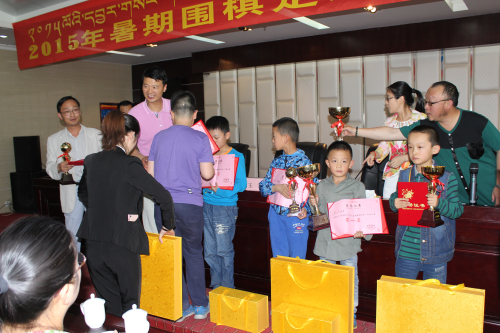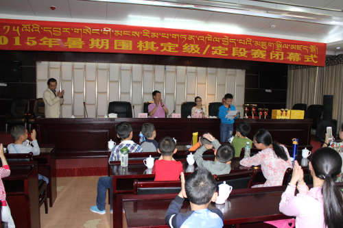 7月28日, 拉薩市2015年暑期圍棋定級(jí)/定段賽頒獎(jiǎng)儀式在拉薩棋院三樓會(huì)議室召開(kāi),出席嘉賓有拉薩棋院院長(zhǎng)王斌、拉薩棋院秘書(shū)長(zhǎng)及職業(yè)圍棋隊(duì)教練陳盈女士、拉薩棋院圍棋部副主任趙鈞、棋院老師陳學(xué)滸及本次參賽的學(xué)生和家長(zhǎng)。首先王斌院長(zhǎng)代表拉薩棋院歡迎大家的到來(lái)。從今年4月26日拉薩棋院成立到現(xiàn)在不到半年的時(shí)間,就已經(jīng)在5月1日、2日成功的舉辦了“2015春季‘阜康杯’拉薩市少兒圍棋定級(jí)賽”,并得到了各界的大力支持和認(rèn)同。為了改善棋手們的學(xué)棋環(huán)境,棋院又投資數(shù)萬(wàn)元購(gòu)置棋桌、棋盤等設(shè)施,棋院在每間教室的休息區(qū)均安裝了WiFi。據(jù)王斌院長(zhǎng)介紹,棋院準(zhǔn)備接下來(lái)培養(yǎng)更多的圍棋老師到各大幼兒園、小學(xué)教授圍棋,待辦學(xué)條件成熟還可能增加書(shū)法等項(xiàng)目,讓西藏的適齡小孩得到更多的琴棋書(shū)畫(huà)的熏陶及教育。