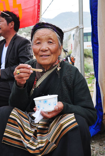 藏戲演出為另一重頭戲。從雪頓節(jié)的第二天開始,在羅布林卡及宗角祿康公園內(nèi),藏戲隊伍每天不停歇地從上午11點一直唱到暮色降臨。據(jù)說,因時間有限,這已經(jīng)是提取劇目中的精華部分,否則一出戲會唱上幾天。表演者自得其樂,觀賞者更是樂此不疲。卡墊鋪在草地上,親朋好友閑適地圍坐在一起,擺上一路背來的青稞酒、酥油茶,還有自己做的各種藏式點心。很多藏民一邊聽著藏戲,一邊搖著手中的轉(zhuǎn)經(jīng)筒,或是捻著佛珠,臉上露出幸福的微笑。