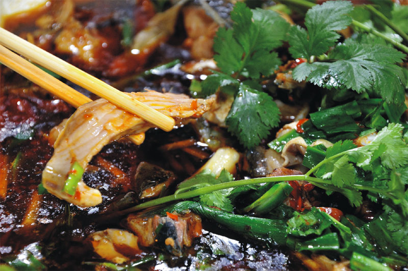 廣東人喜歡煲湯,卻把老火湯里豐富的湯料稱為湯渣,一般只作為正菜前的消遣而已。四川人的燉菜則是絕對的主角,無論是家里的餐桌還是飯店的酒席,一般上了燉菜,也就意味著宴席進入高潮。過去,家里最喜歡做海帶燉雞,老母雞加海帶,拍幾片生姜,扔一束香蔥,快起鍋的時候灑一些鹽,湯清肉香,老遠聞到就忍不住想去揭一下鍋蓋。那時,我最得意的是用小碟子,只放一些干辣椒粉和鹽,舀一小勺雞湯拌勻了,做成蘸水,隨手揭一塊雞皮在蘸水里一裹,滋味純粹而濃烈,讓人每次想起,都忍不住要閉上眼睛猛吸一口氣,仿佛那味道又在舌尖上打轉(zhuǎn)。