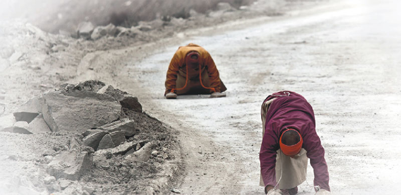 這是快樂美好的七個(gè)月,這七個(gè)月我們度過了拉薩舒適的夏季、絢麗的秋天、干燥而陽光燦爛的冬季,領(lǐng)略了雪域高原的大美風(fēng)光和藏區(qū)神圣的宗教人文景觀。五彩的經(jīng)幡在湛藍(lán)的天空下飄揚(yáng)、清澈見底的高山湖泊在明媚的陽光下泛著七彩的波光,高聳入云的雪山讓人仰望;喇嘛紅衣、匍匐在朝圣路上的信徒,在西藏這片熱土上屹立著堅(jiān)定的信仰。我不懂他們,我只是靜靜看著他們,在目光相遇的時(shí)候,給一個(gè)微笑,我便得到了發(fā)自心底的快樂、滿足和信任。在他們面前,一切都變得簡單、虔誠、付出也是一種快樂。認(rèn)識了車隊(duì)的巴次,知道了巴次的一些故事,留心著他的言行,我知道了一個(gè)普普通通的藏族青年,有著佛一樣的慈悲心,他就那樣付出著、快樂著……我被感動著,感染著。